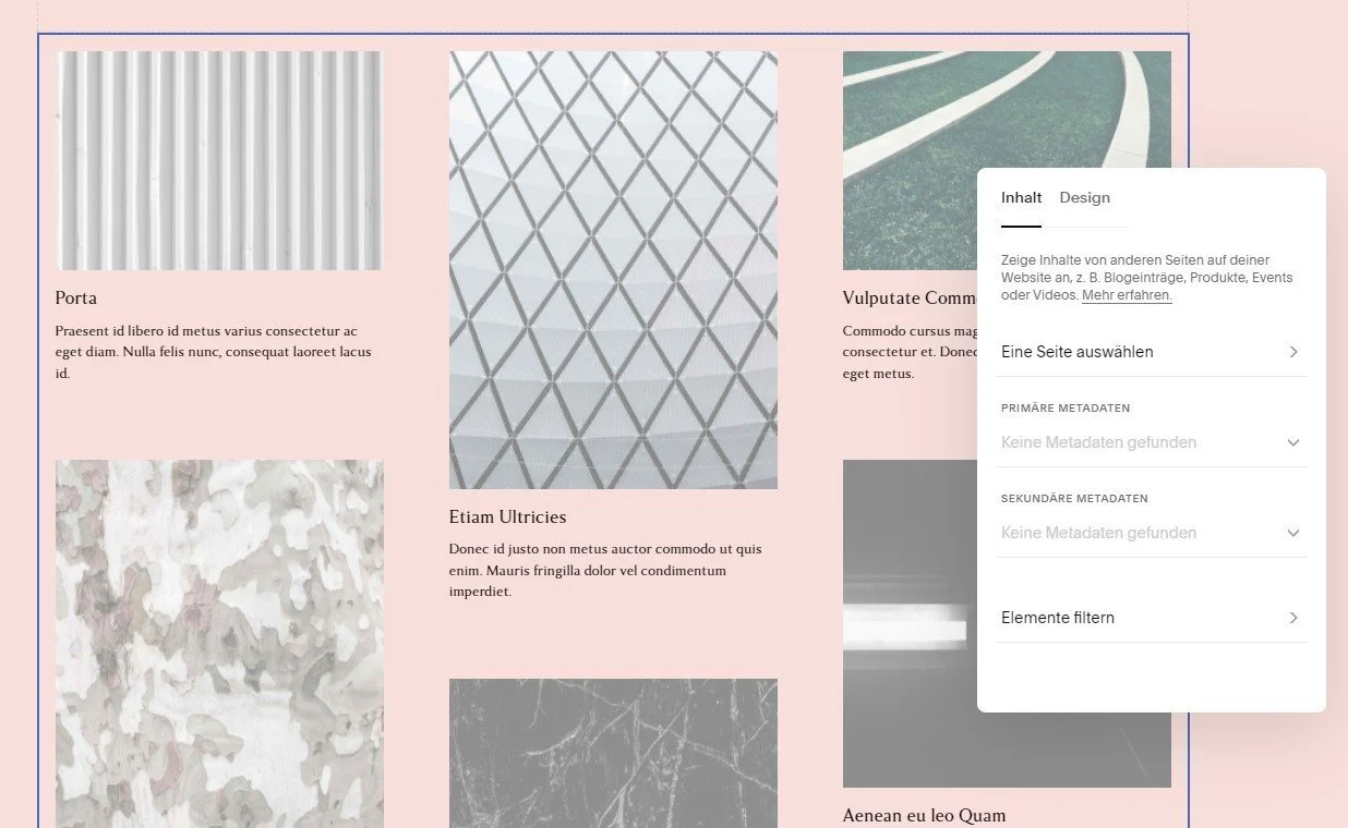 Am besten dafür eignen sich: Blogeinträge, Produkte oder auch Videos. Im Tab “Inhalt” kannst du auswählen, welche Informationen du anzeigen möchtest und im Tab “Design” kannst du Layout-Einstellungen vornehmen: