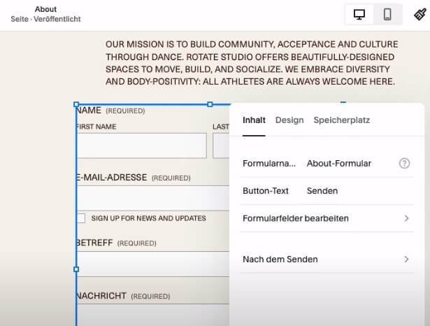 Nehmen wir mal an, du hast die About-Seite ausgewählt. Suche dir nun einen Platz auf dieser Unterseite aus, wo du das Formular gerne haben möchtest.