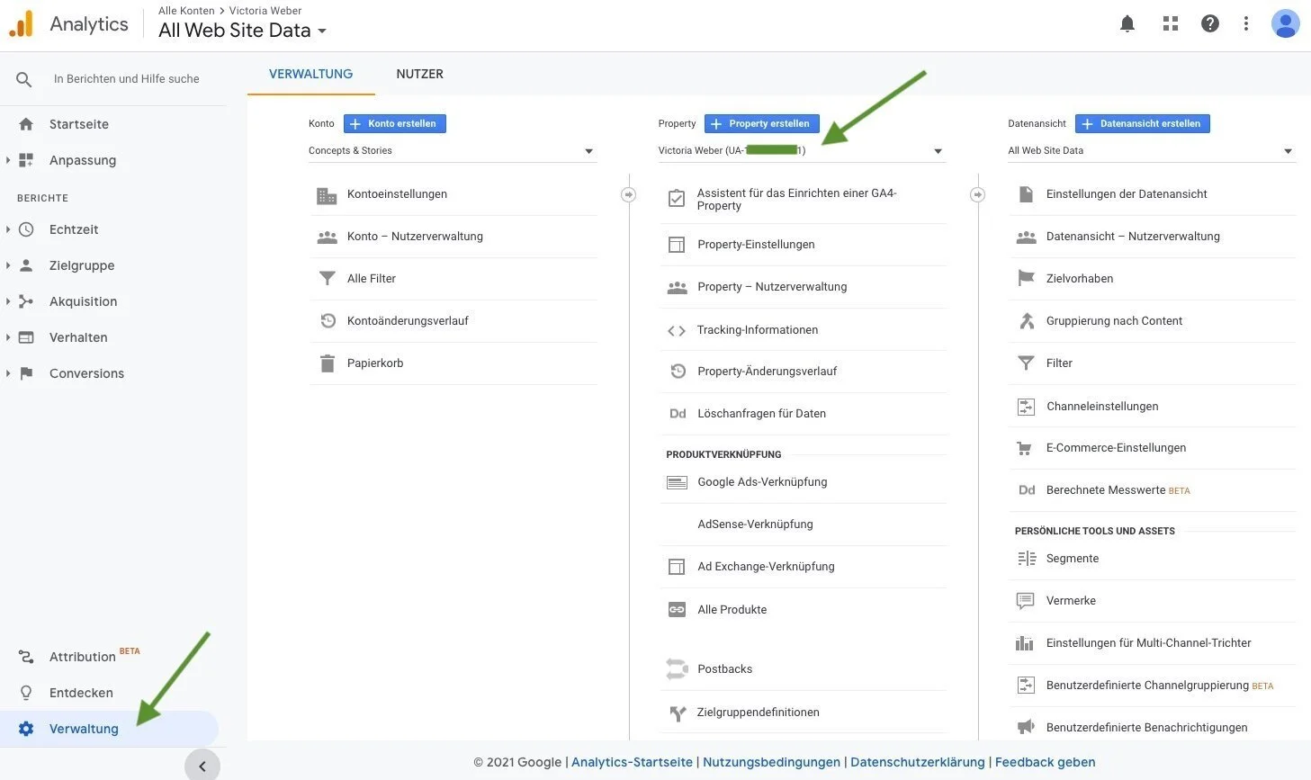 Du kannst den Code finden, indem du bei Google Analytics links im Menü auf “Verwalten” klickst, dann dein Property auswählst (falls du mehrere hast) - und oben findest du dann den Code:
