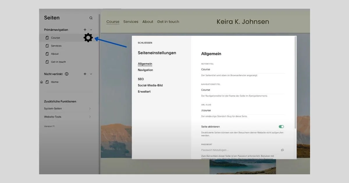 Du suchst dir in der Navigation die Seite aus, bei der du beides ausblenden möchtest. Neben der Seite findest du ein kleines Rädchen, auf das du einfach draufklickst. Dann öffnen sich die Seiteneinstellungen.