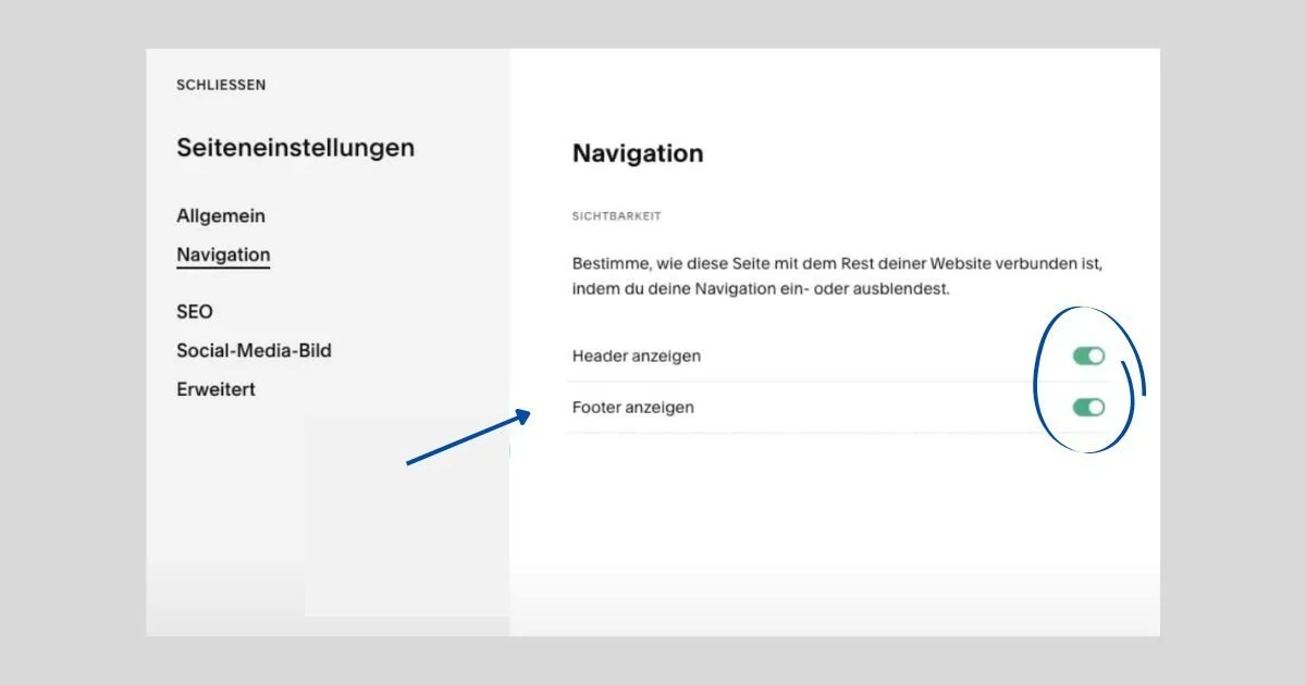 Bei den Seiteneinstellung gehst du auf den Menüpunkt “Navigation” und dann siehst du schon zwei Unterpunkte ‘Header anzeigen’ und ‘Footer anzeigen’.