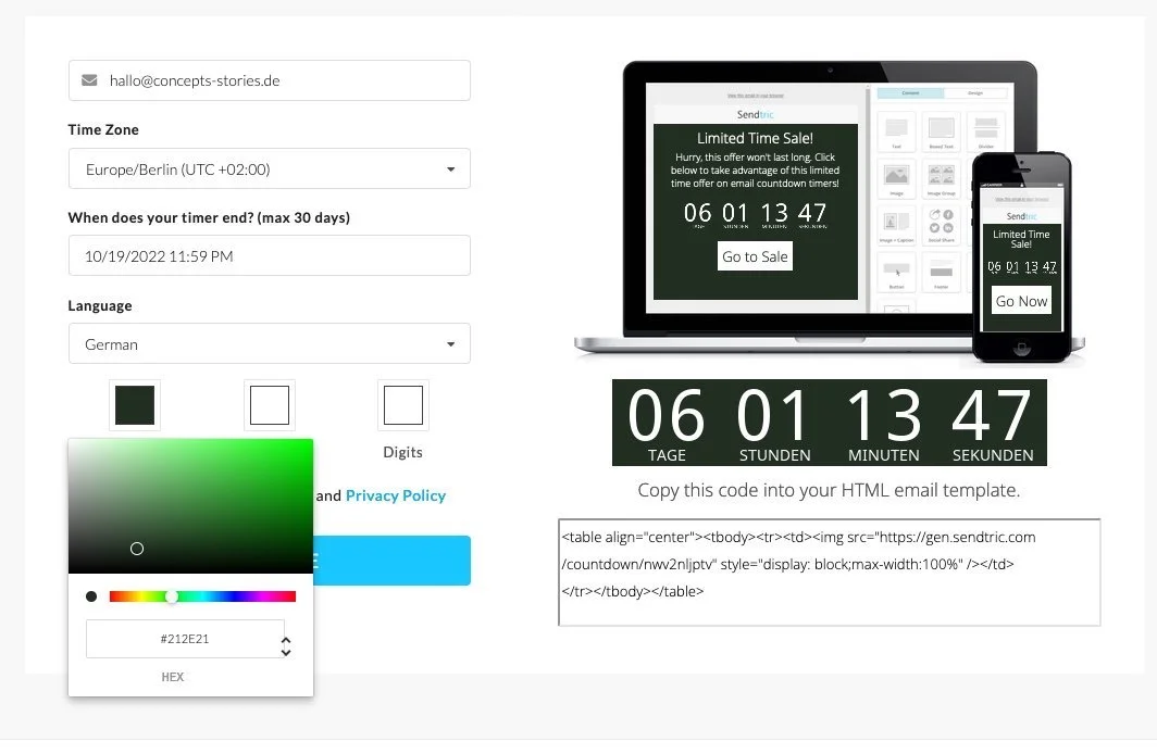 Ansonsten musst du eigentlich nur wissen, wann der Countdown ablaufen soll - und dir überlegt haben, welche Farbe der Hintergrund und der Text haben sollen. Dazu brauchst du den HEX-Code.
