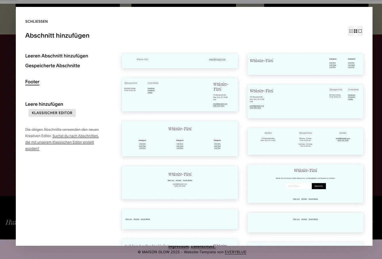 Squarespace lässt dich übrigens bei den Abschnitten direkt vorgebaute Footer aussuchen, wenn du keine Ahnung hast, wie du das aufbauen kannst: